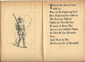 I found this in one of my gran’s journals from World War One. It is about 20 pages, and reads like a child’s song. The goal of the pamphlet is to try and sell Liberty Bonds- in Canada we call them Victory Bonds. During World War One, governments created these bonds to help pay for the war. It was a way for people who were not fighting- or that couldn’t fight, to support the war effort. They would give the government their money and after a few years, would earn interest on their investment. I’m not certain how the American government did with this venture, but it was very successful in Canada.