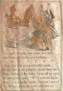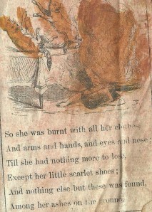 Um…creepy…I really don’t think this would be acceptable for children in our society- mind you we are becoming more graphic with our cigarette packages….and it seems to me that every nursery rhyme or story I know ends up in the death of someone: Rock a Bye Baby, Jack and Jill, Ring Around the Rosy, Hansel and Gretel, Gingerbread Man etc… Why is there so much death in childrens stories? Perhaps fear is the best way of controlling -youth..possibly everyone…hmmm…food for thought….