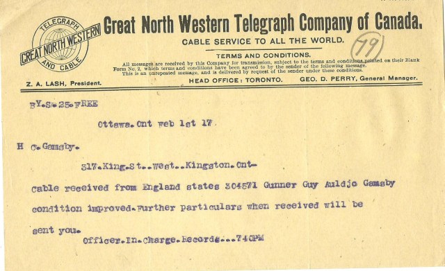 Marjorie had a letter from Donald Fraser (first love?) and I had one from Mrs. Gill.  She does not know at all of Guy’s illness.  I got another cable last night from the Militia Department.  It said “Condition improved further particulars  when received will be sent you.”