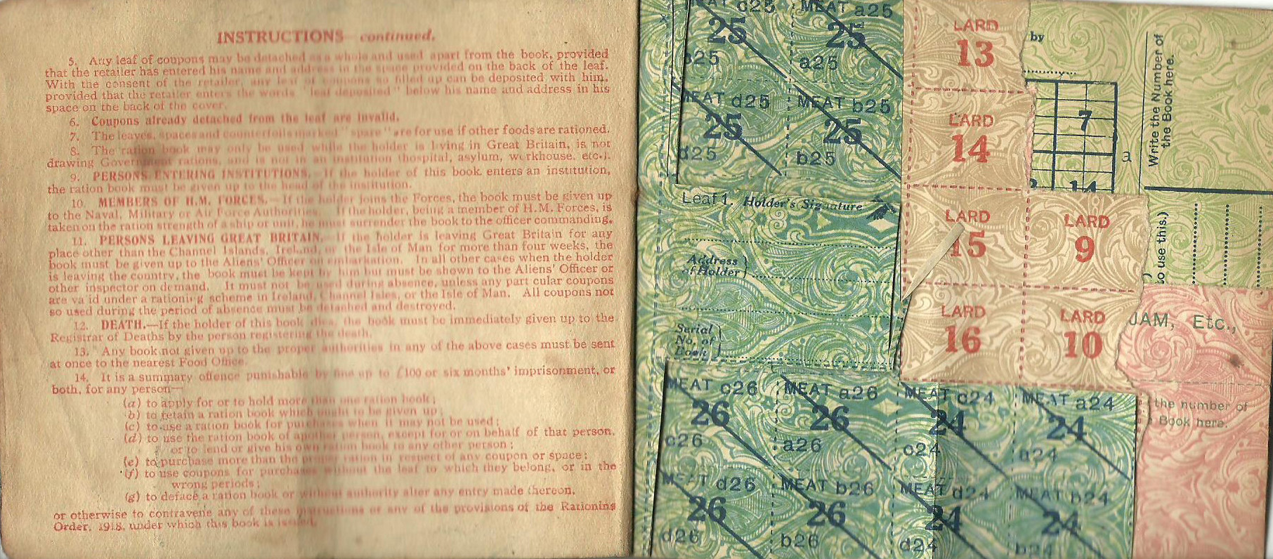 Rationed food in this booklet: meat, lard (yum!), jam, butter and margarine.