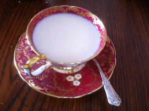The first day I actually attempted to give Morgan Cambric tea- this is a term my grandfather used- I really don’t know if it is a real beverage or something he made up. It is a combination of a little bit of tea, with a great deal of milk. I wasn’t really surprised that she didn’t like it, but I wanted to give her the opportunity to try it. I remember feeling very grown up when my grandfather presented me with my first tea. I don’t know if I liked it, but I kept taking it on the principle that it was an initiation into a realm of the adult world.