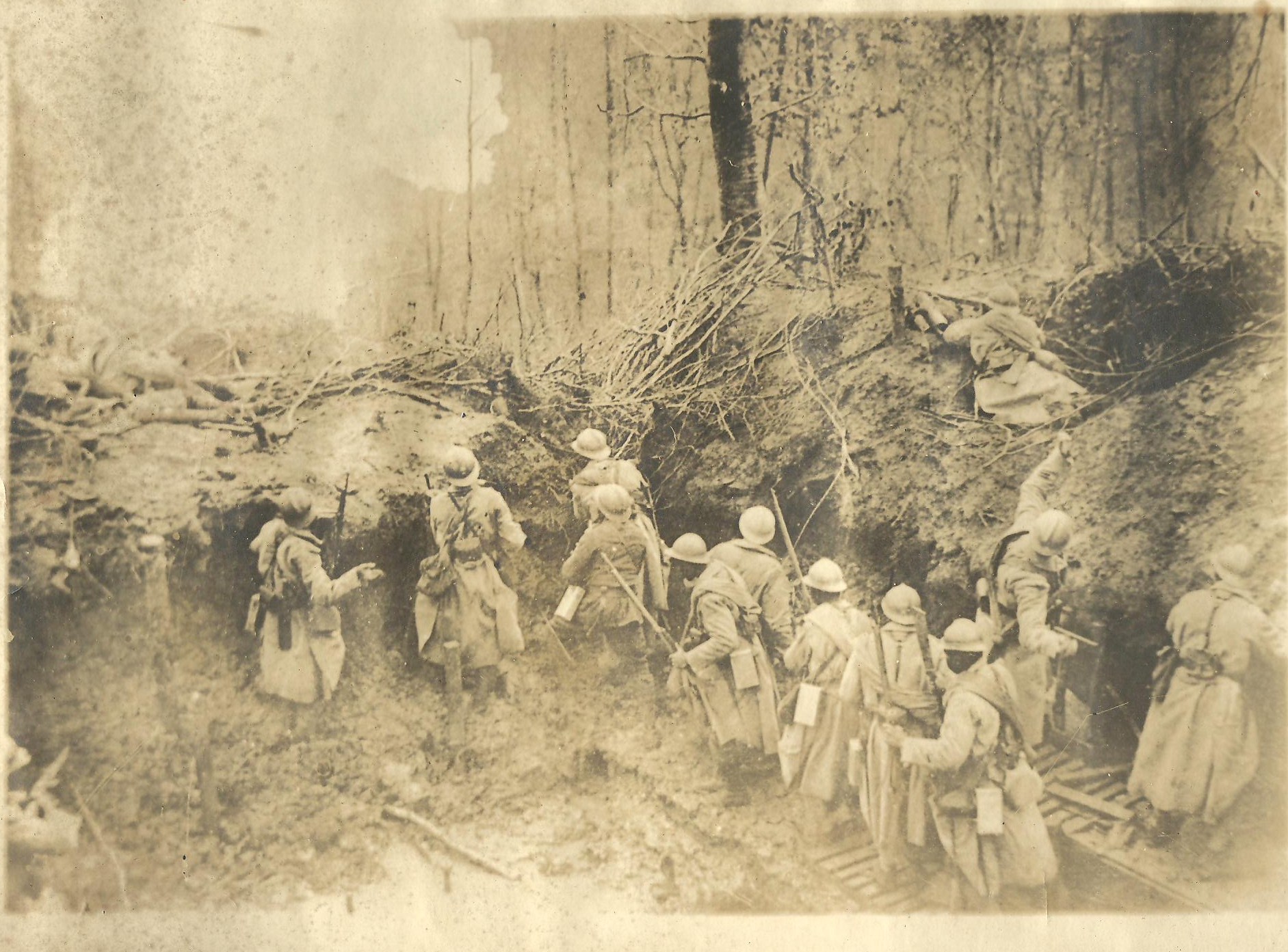 The back of the photo states that this is a ‘French Regiment attacking a German trench.’ I would love your feedback. Do you see in the distance a wave of ‘smoke’ creeping in on the top left ? Are these possible Algerians? They did fight in the battle of Ypres. Could this be Ypres?