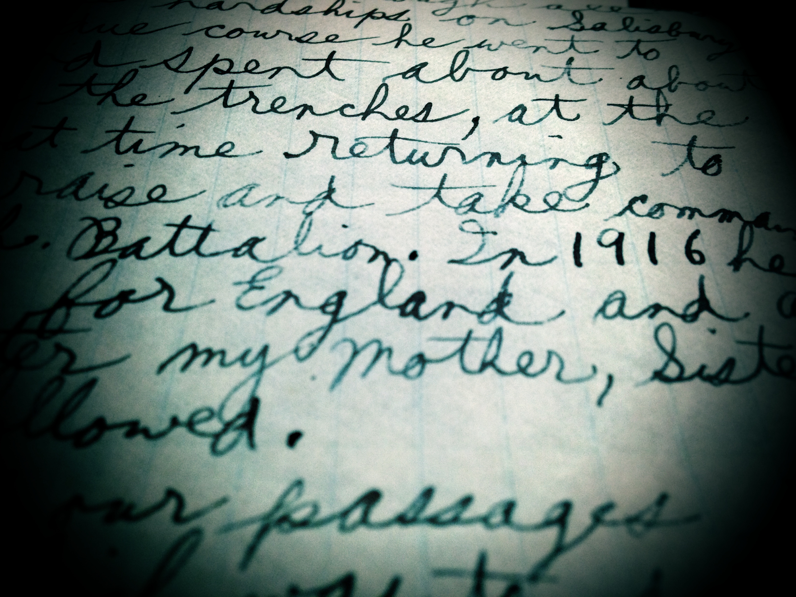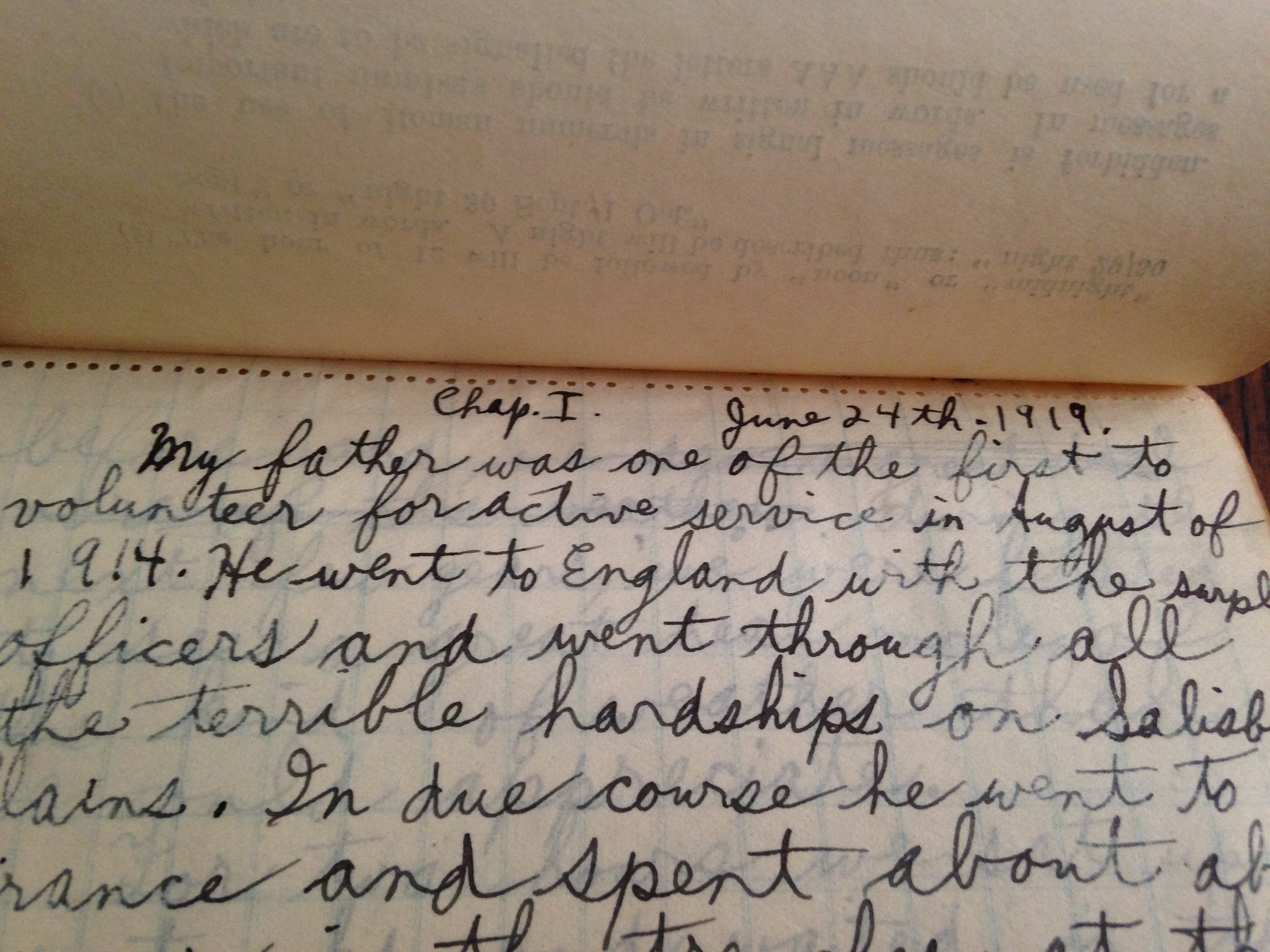 (I found one of my grandfather’s journals while I was looking in a bin of family artifacts. It was written in a service book. It seems fitting somehow as the anniversary of the First World War approaches. This, combined now with my personal connection with England: I have explored and photographed Salisbury Plain with people very dear to me. )