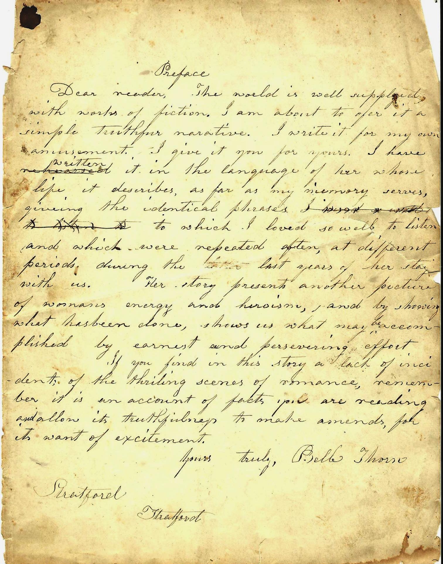 Dear reader. The world is well spplyed(sic) with works of fiction. I am about to ofer(sic) it a simple truthfur (sic) narrative. I write it for my own amusement. I give it you for yours. I have written it in the language of her whose life it describes, as far as my memory serves, giving the identical phrases to which I loved so well to listen and which were repeated often, at different periods during the last years of her stay with us. Her story presents another picture of womens (sic) energy and heroism, and by showing what has been done, shows us what may be accomplished by earnest and persevering effort.