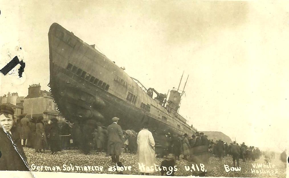In the peace negotiations that ended World War One Germany’s Imperial navy was surrendered to the Allies. In the morning of April 15, 1919 this German submarine SM U 118 was on its way to Scapa Flow when it broke from the ship that was towing it and ran aground on Hastings beach. Outside of the Queens Hotel also found on the beach.